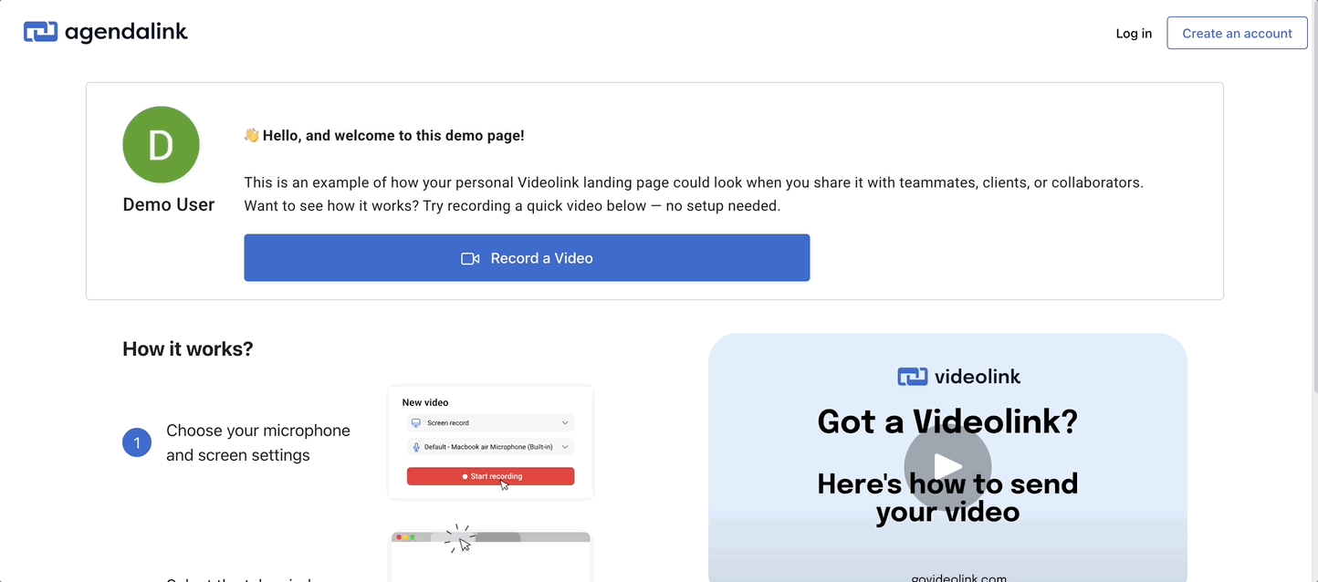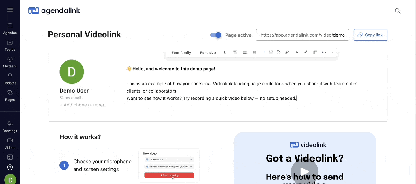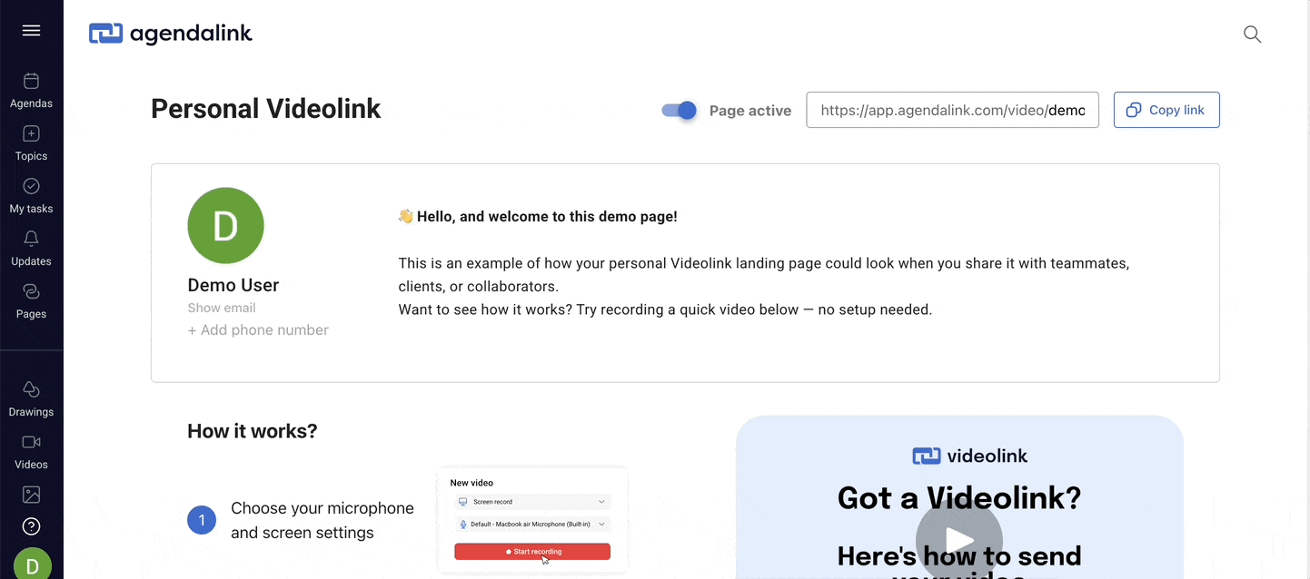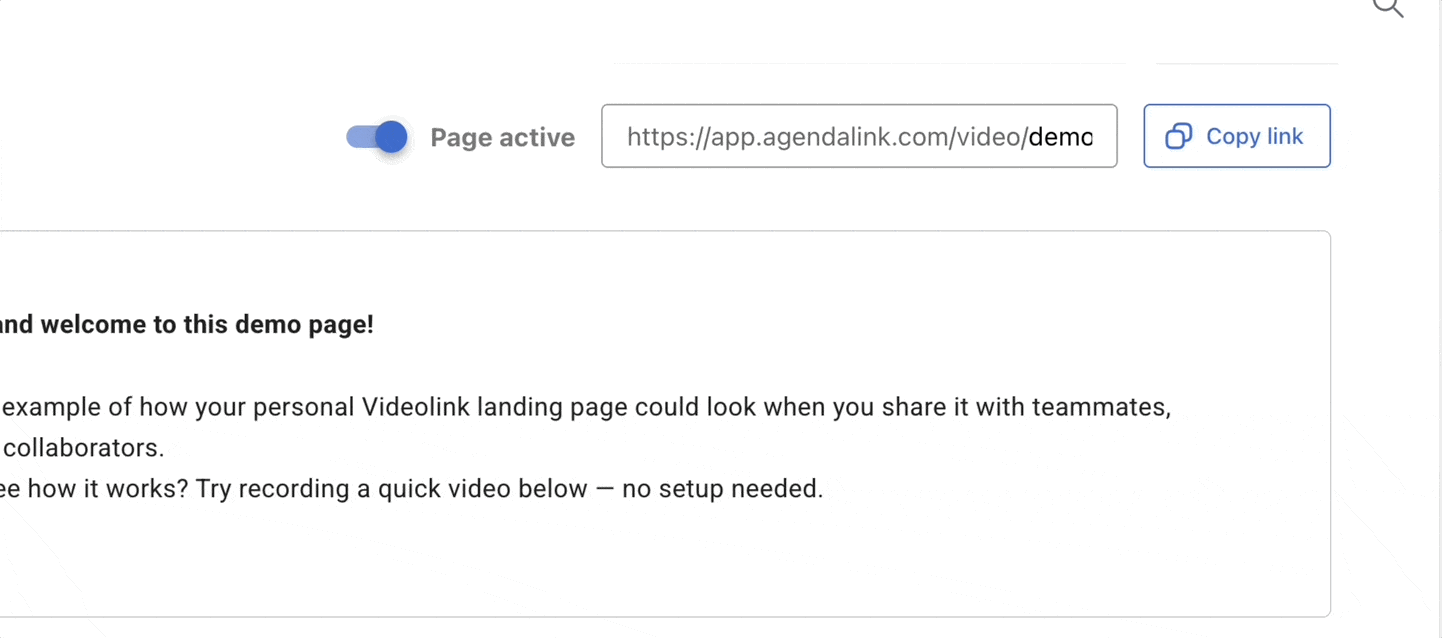 Your Personal Videolink Page is a unique link that allows others to record, edit, and send you a video – without needing an account. You can use it to request input, updates, demos, or feedback via video instead of live meetings or long written instructions.