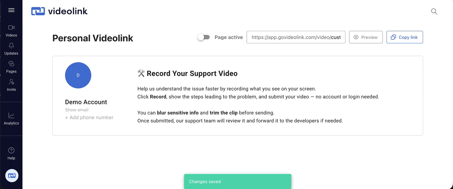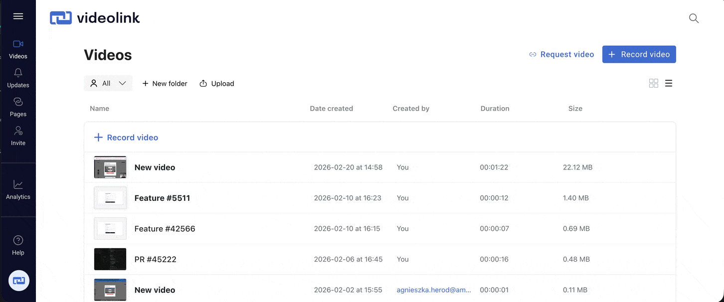 Your personal Videolink page lets others send you videos without needing an account. Instead of long written explanations, teammates, customers, or stakeholders can simply record a short video to show what they mean.